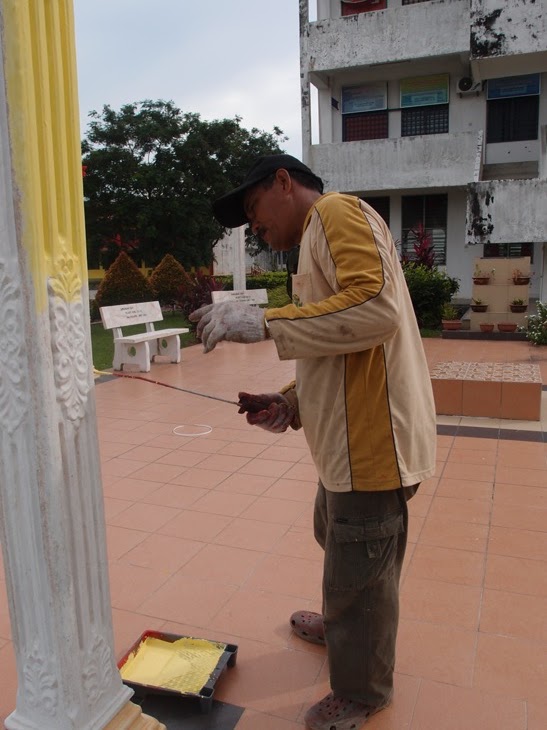 The drivers, the peons and the lab assistants were entrusted with the task of giving a new coat of paint to the many pillars and poles. Red and yellow were chosen as they were the signature colours for the vocational college in Malaysia.